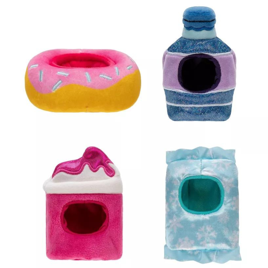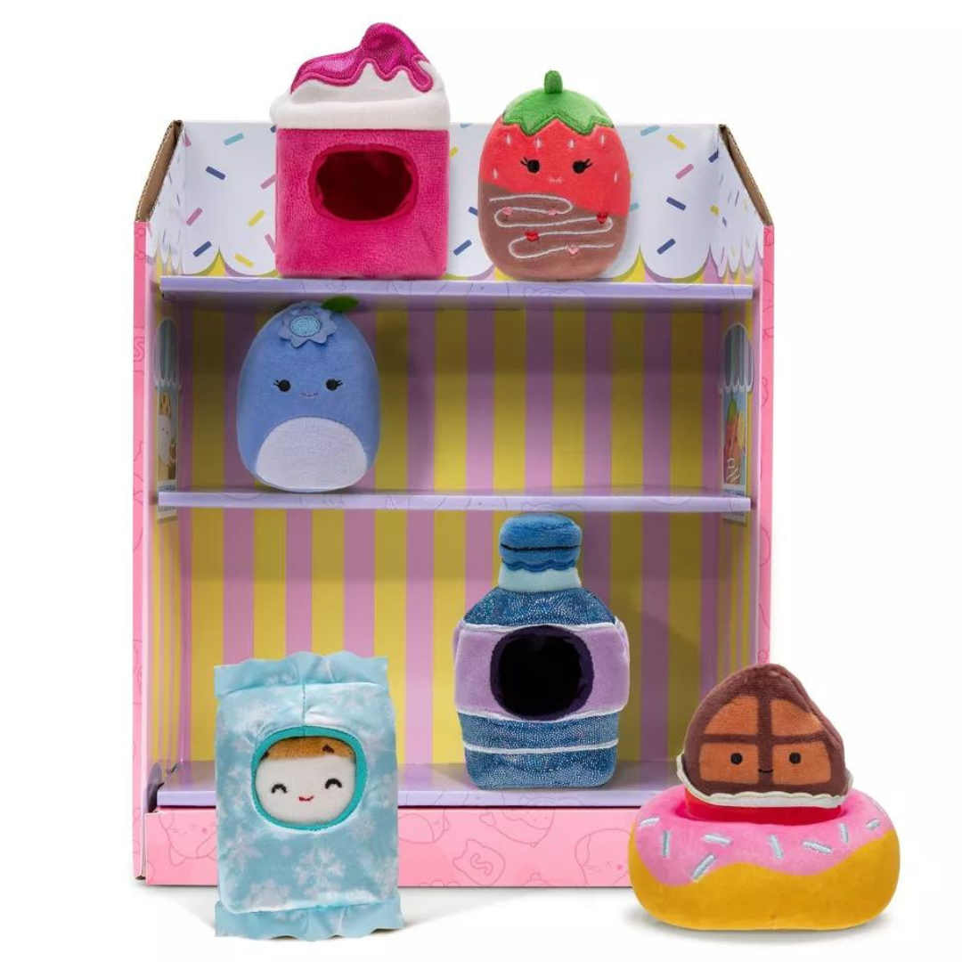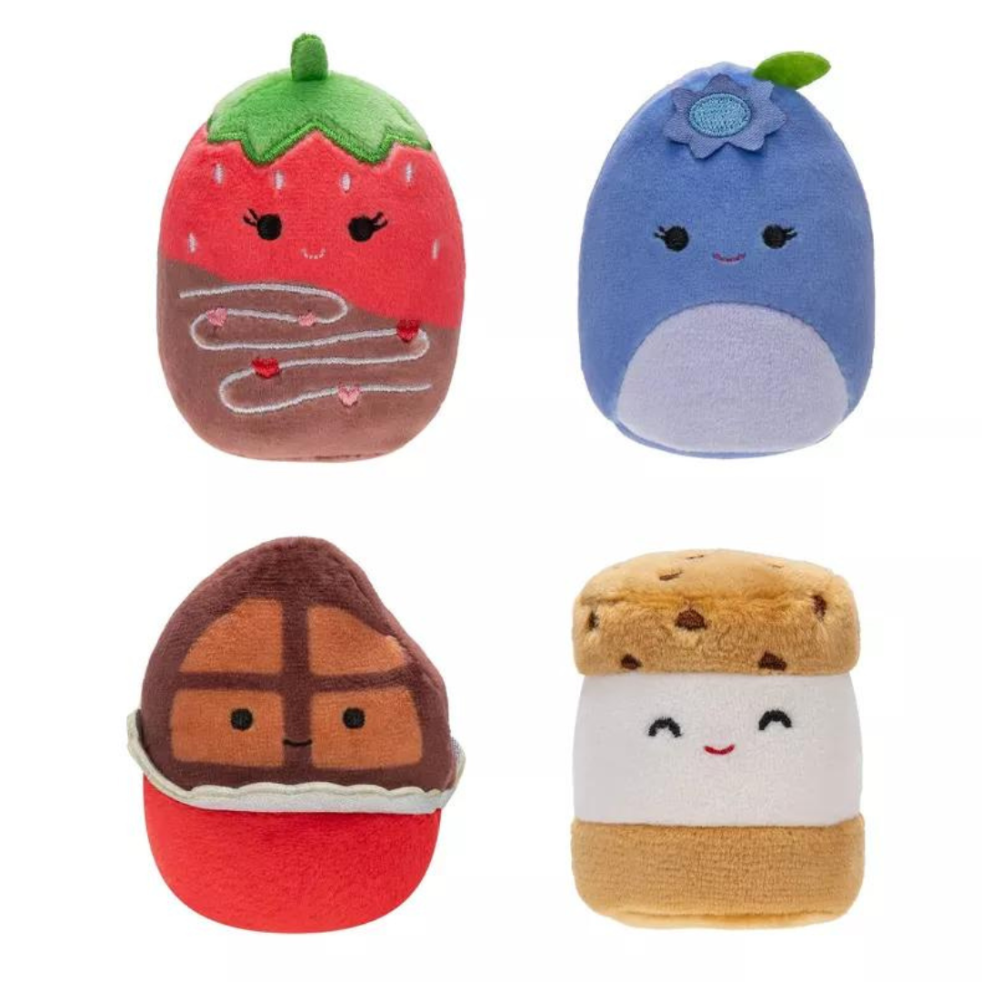 - DULCES: Bluby the Blueberry, Kaoko the Ice Cream Sandwich, Scarlett the Chocolate Dipped Strawberry y Paulton the Chocolate Bar Squishmallows están incluidos.